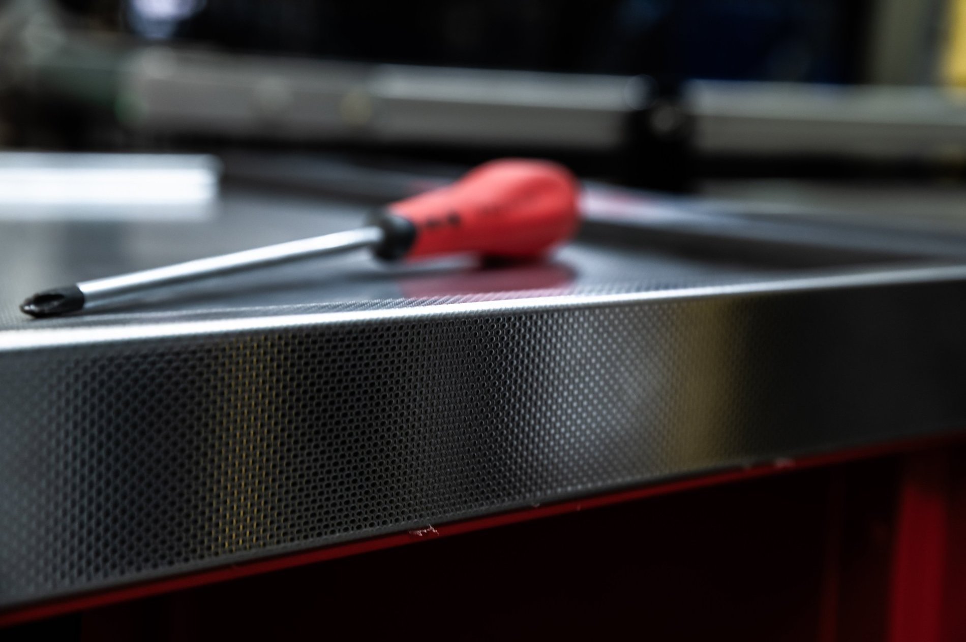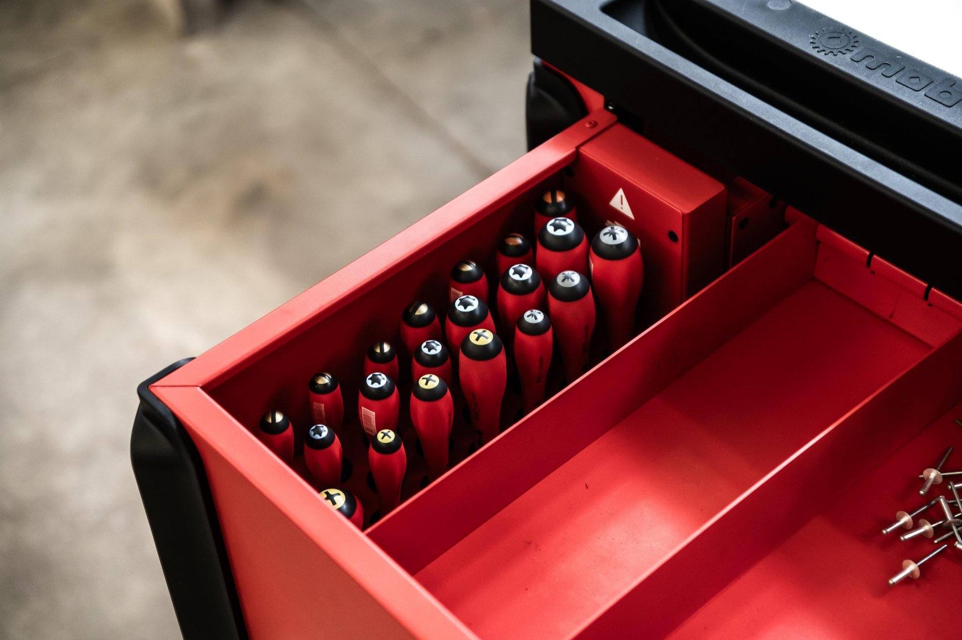 Sur le plan de travail secondaire de la Cockpit, 20 emplacements spécialement conçus accueillent les tournevis, les maintenant en position verticale pour une accessibilité optimale. Lorsque la servante est ouverte, les tournevis sont à portée de main, éliminant ainsi le besoin de modules de rangement supplémentaires. Une fois la servante fermée, les tournevis sont sécurisés, évitant tout emprunt non autorisé. De plus, il n'est pas nécessaire de les ranger chaque soir, offrant un gain de temps appréciable. En résumé, la Cockpit garantit une organisation efficace et une sécurité accrue pour les outils.